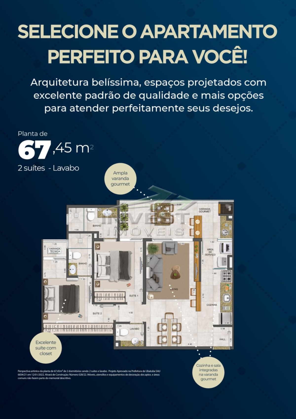 Tipo 1: 67,45 m² 2 suítes, varanda gourmet e 2 vagas na garagem.