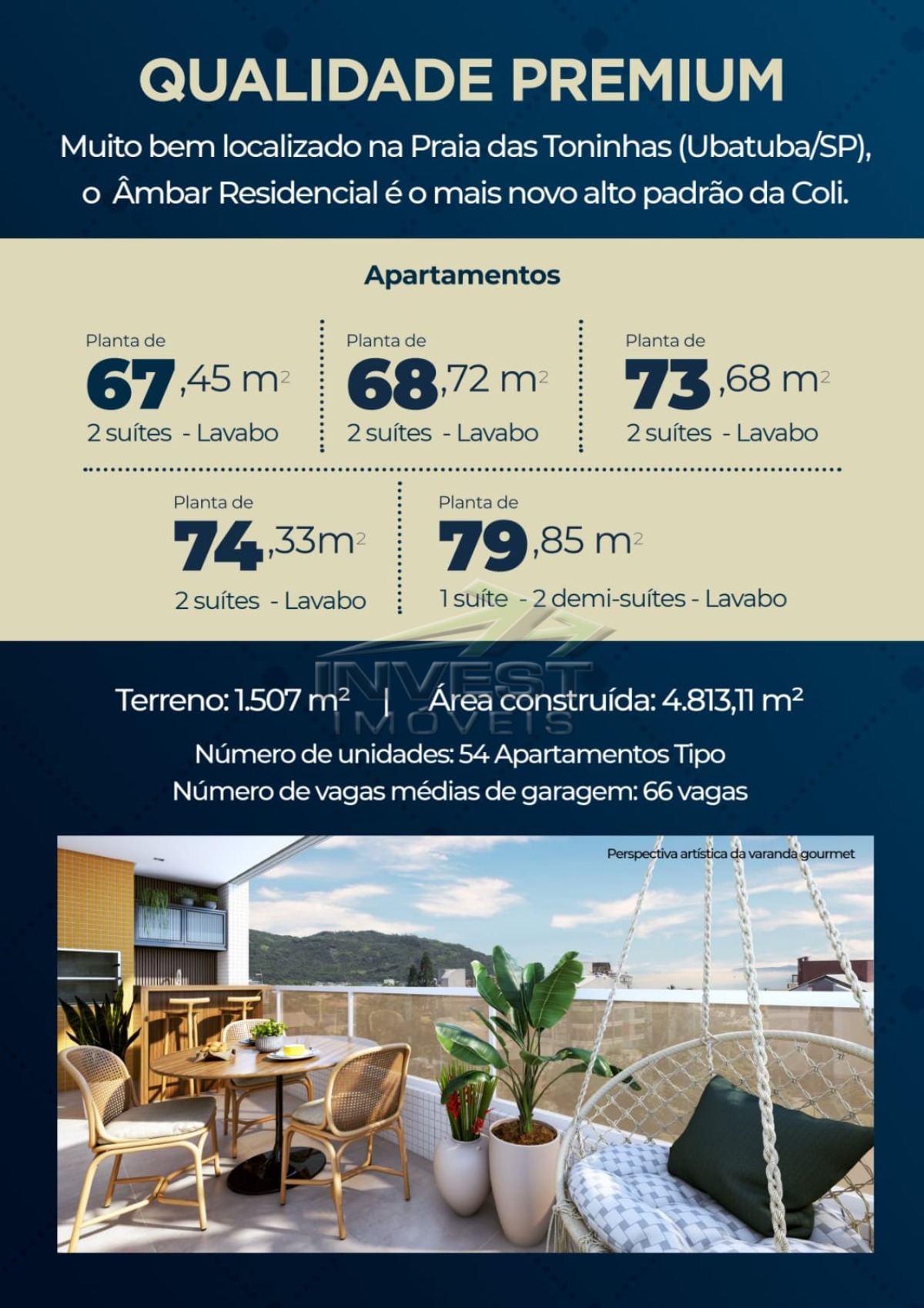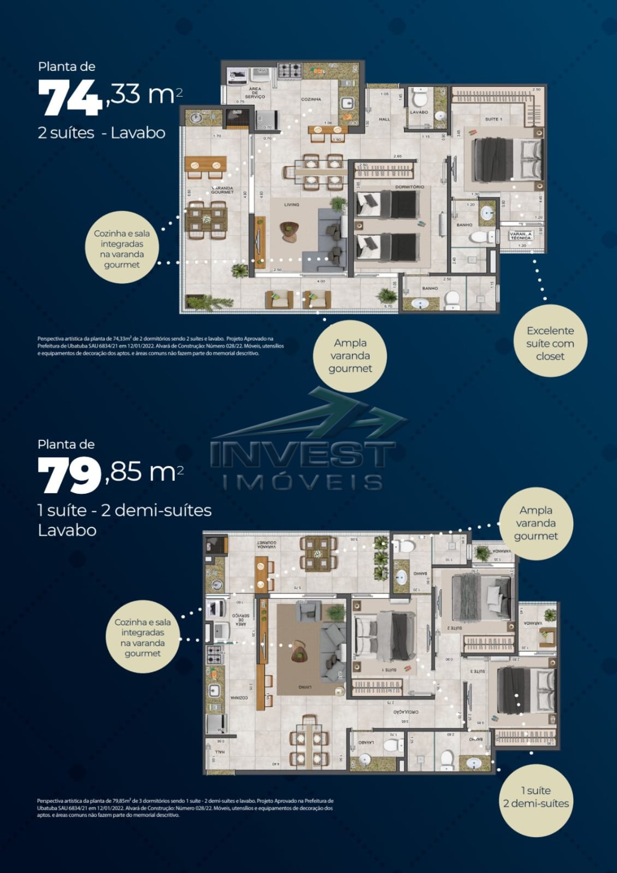 Tipo 5: 79,85 m² 1 suíte, 2 demi-suítes, varanda gourmet e 2 vagas na garagem.